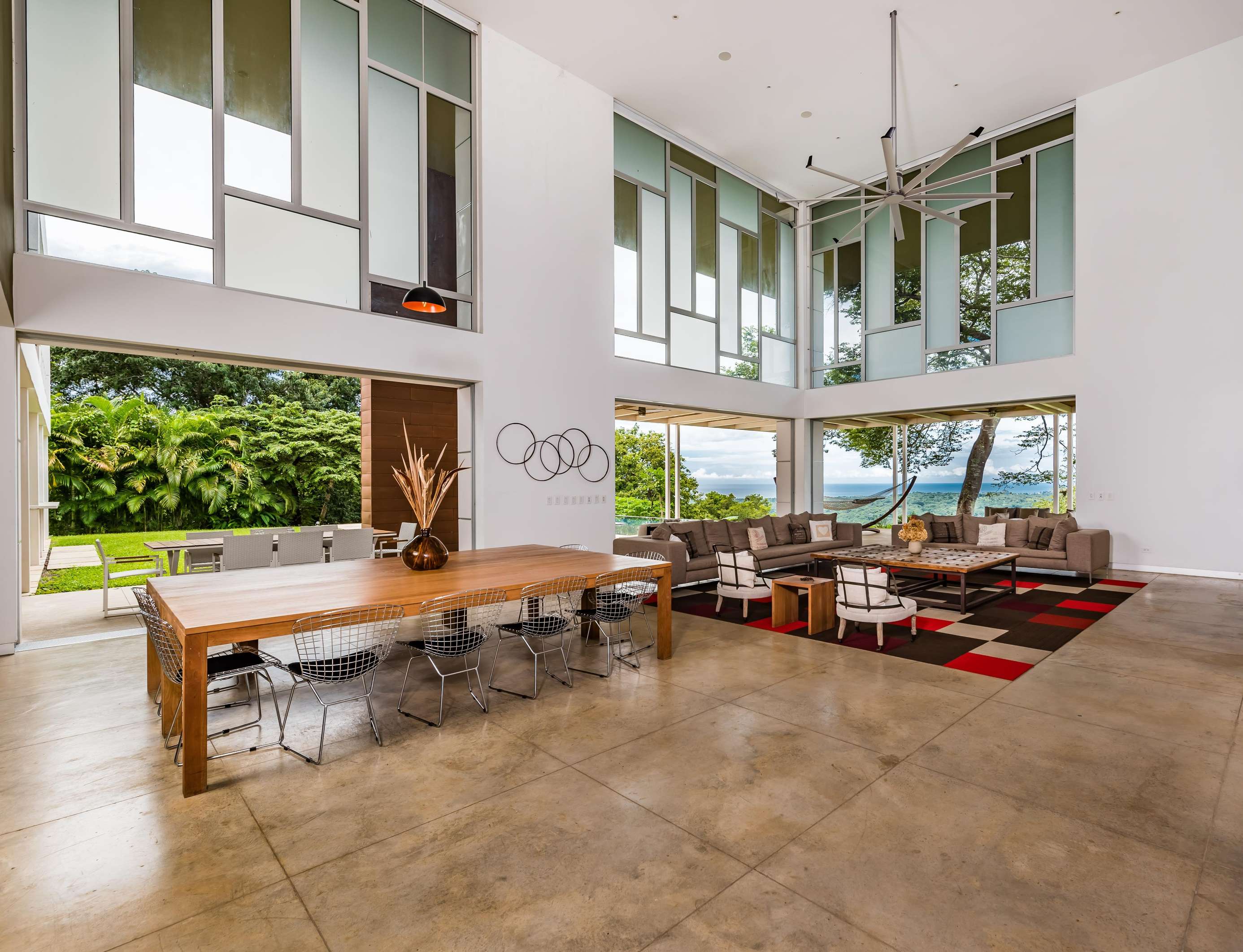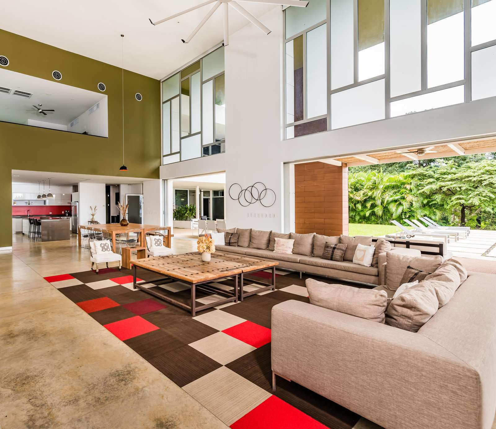 The living space & kitchen area are truly magnificent. It’s a full open concept with 24-foot ceilings and glass doors that slide into the walls to access the vast exterior living space.